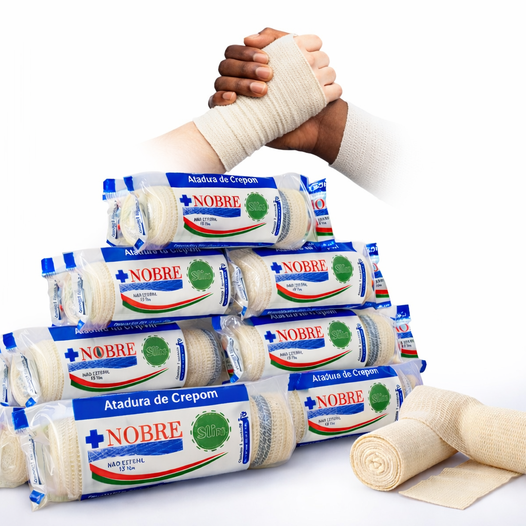 12 Rolos de Atadura de Crepom Nobre, tamanhos 10cm, 12cm, 15cm e 20cm x 1,8m (largura x comprimento), fabricada com materiais de alta qualidade e cadastro na ANVISA, garantindo segurança e confiabilidade para uso profissional.