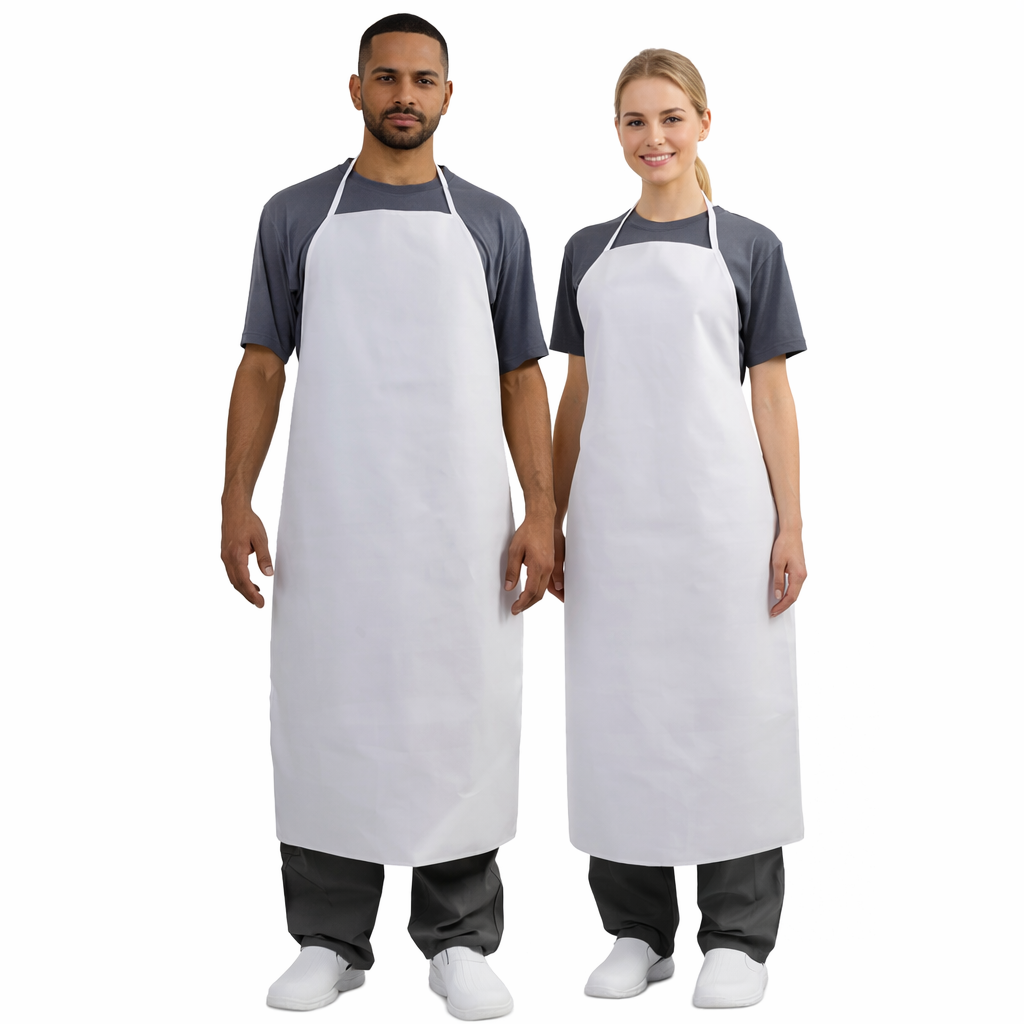 Avental de segurança, impermeável a líquidos não corrosivos, confeccionado em PVC Branco nas seguintes dimensões: comprimento total 120cm e largura total 70cm. Tira soldada dobrada eletronicamente.