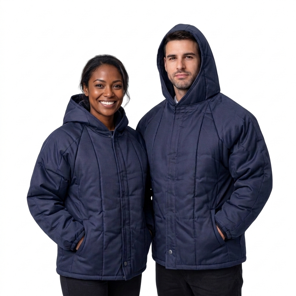 Japona confeccionada em tecido de náilon (nylon) com resina, forrado internamente com manta térmica de poliéster, com capuz, bolsos laterais, fechamento frontal em velcro alinhado por botão de pressão, malha sanfonada para ajuste na barra e punho, para baixa temperatura Cores azul ou branco.
