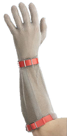 Luva em Malha de Aço INOX, 5 dedos, com punho 21cm para a proteção total da região do pulso e do antebraço, ambidestra (reversível - para destro ou canhoto), marca EUROFLEX® (Germany). Tamanhos PP, P, M, G, GG.