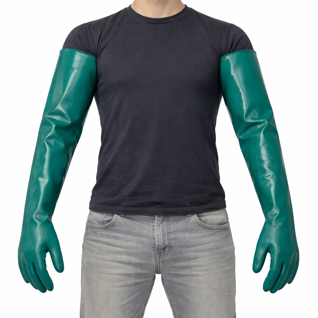 Luva em PVC Forrada Verde e palma áspera para ser usada na limpeza de galerias e materiais escorregadios ou oleosos, punho 70 cm. Vendida o par.